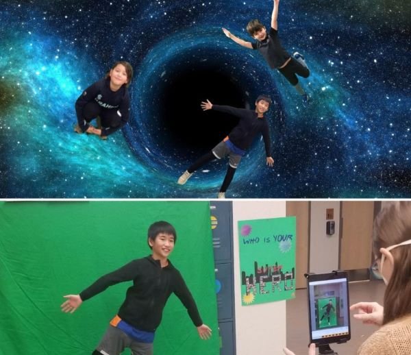 It turns out that it takes creativity to figure out buddy activities when your buddies are in a different cohort, but it can be done! We've had lots of "meetings" with buddies on opposite sides of big windows, playing games and doing art projects. These prekindergarten and 4th grade classes had another fun idea. Separately, students took photos against the green screen, and then they turned them into fun joint images like this one!