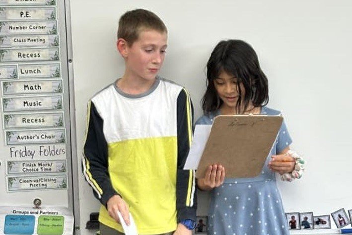 Above: Students in Melissa Young's class preparing to lead this month's assembly! To continue the year-long theme of “community,” they chose to focus on culture and holiday celebrations, identiying over 15 different holidays celebrated by current PD Evergreen families! Students interviewed K-3 classes to learn more about the holidays celebrated in each classroom, and they created a slideshow presentation for Friday's assembly.