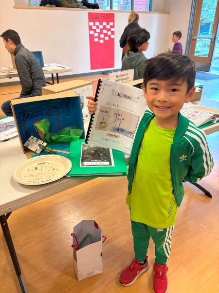 Over the course of the year, kindergartners have several opportunities to practice their speaking skills in age-appropriate ways. All three classes hold "Celebrations of Learning" to wrap up several big units, such as Force & Motion and their Wetlands unit, and during these, students and guests—sometimes their classmates, sometimes 4th grade buddies or even their parents/guardians—arrive for presentations. Often guests move around the room, science fair-style, to hear from students about their projects.
