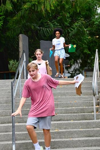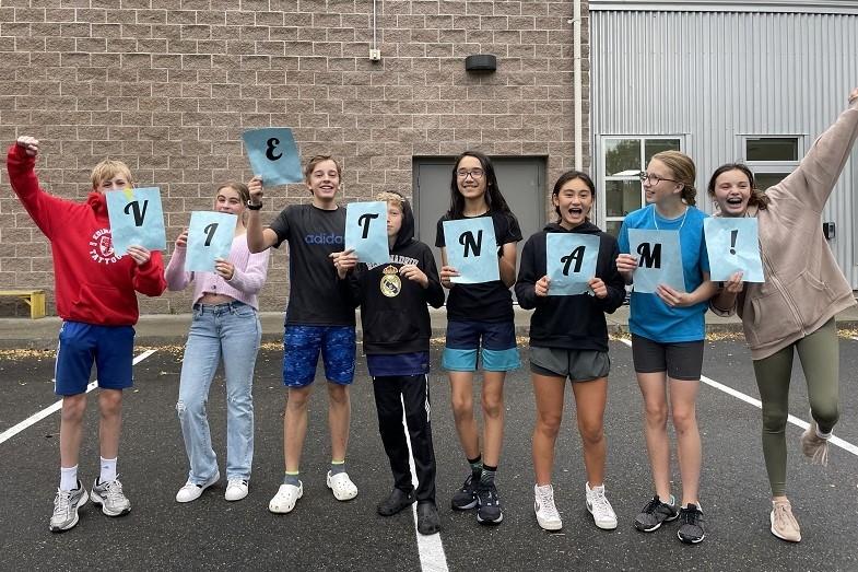 Big reveal! The 8th graders have learned that the destination of their capstone Global Studies trip next May will be ... Vietnam! But they weren't simply told the location. Instead, they were divided into groups and all took part in a frenzied scavenger hunt all over campus, finishing up with a single letter each, which they had to work together to arrange into correct order, finally spelling out the trip destination!